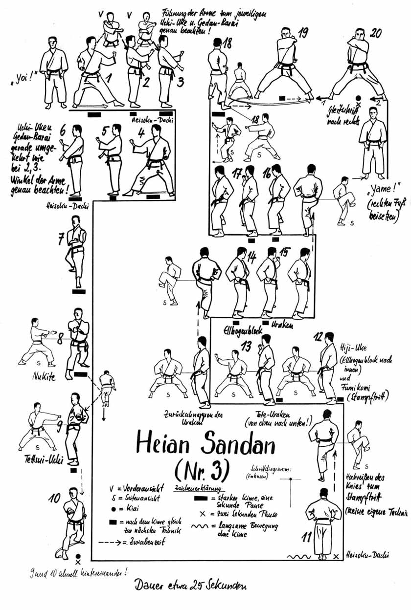 Uno de los elementos más difíciles de Heian Sandan ocurre regresando abajo del "I" del embusen (línea de kata) en que el practicante debe realizar una serie de movimientos en Kiba-dachi mientras simultáneamente bloquea y golpea.