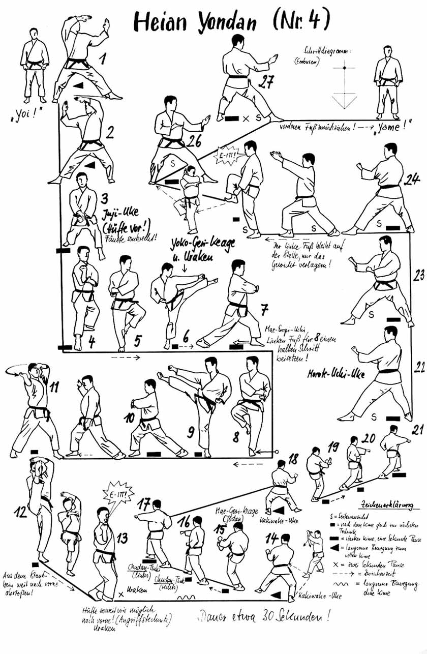 Heian Yondan ofrece desafíos al practicante, principalmente por las patadas de costado y las posiciones Kokutsu Dachi.